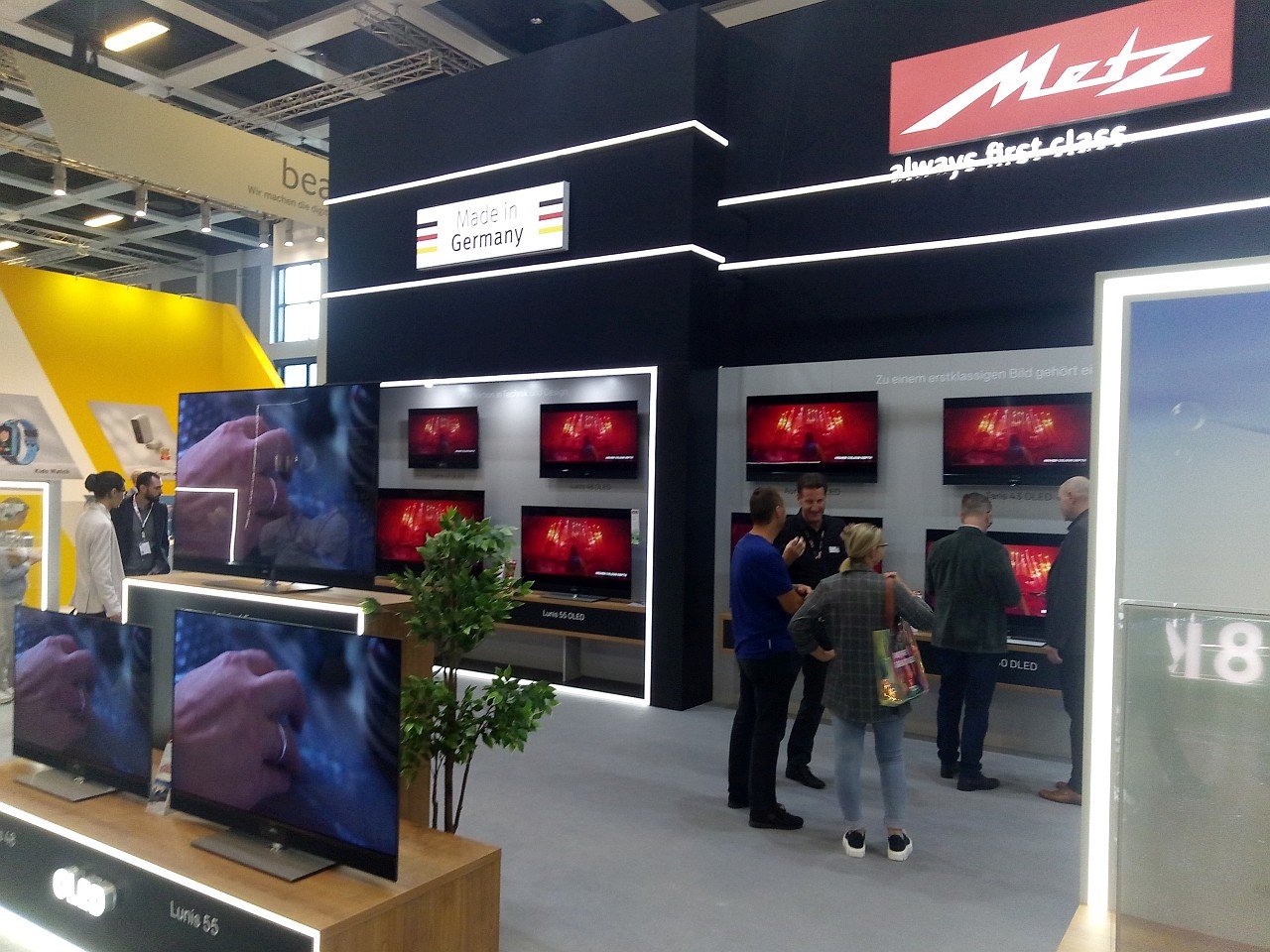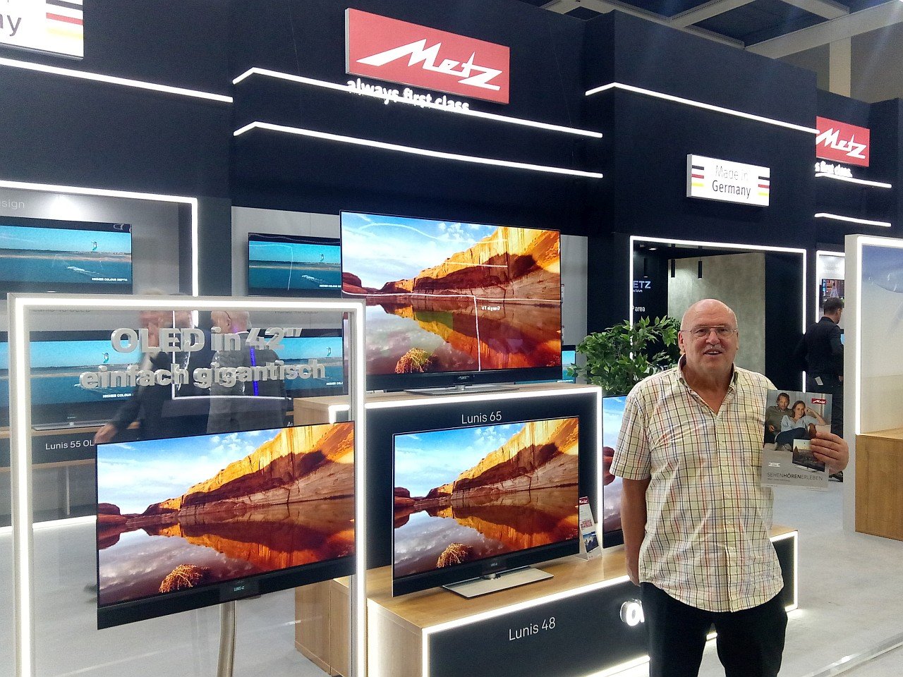 Auf dem Messestand der Firma METZ ließ sich Radio- und Fernsehtechnikermeister Heinz Steens die neuen Fersehgeräte des traditionsreichsten deutschen Unternehmens vorführen. Neben dem METZ Classic Sortiment zogen besonders die Geräte der neuen OLED-TV-Familie Lunis mit einer Bildschirmdiagonale von 42 bis 65 Zoll die Blicke auf sich.