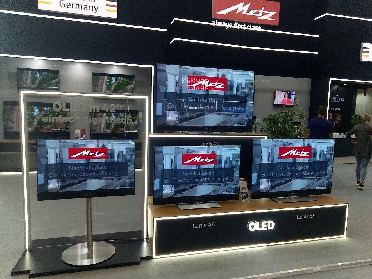 Auf dem Messestand der Firma METZ ließ sich Radio- und Fernsehtechnikermeister Heinz Steens die neuen Fersehgeräte des traditionsreichsten deutschen Unternehmens vorführen. Neben dem METZ Classic Sortiment zogen besonders die Geräte der neuen OLED-TV-Familie Lunis mit einer Bildschirmdiagonale von 42 bis 65 Zoll die Blicke auf sich.